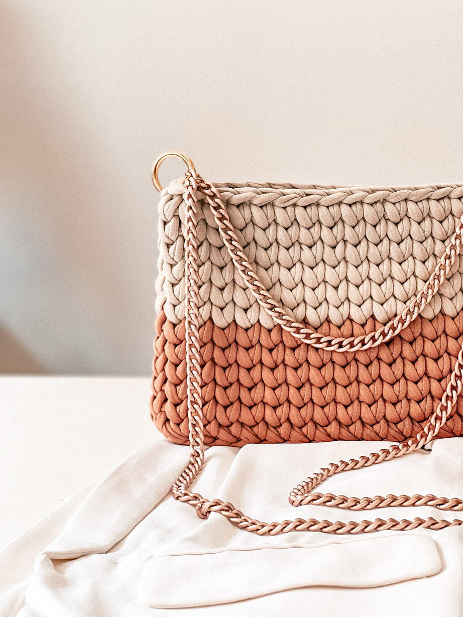 O material utilizado é o fio de malha, um fio mais grosso e moldável, que dá estrutura às peças e torna a produção mais rápida.