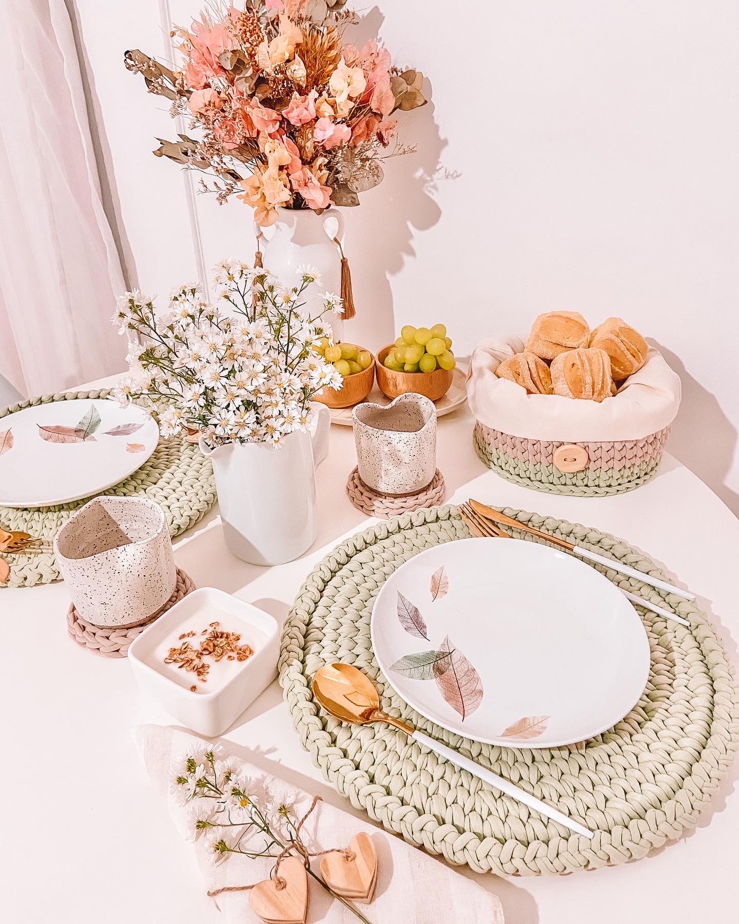 Para mim, a combinação de crochê com cerâmica fica muito linda na mesa posta. Em parceria com a Lavanda, marca de cerâmicas artesanais, desenvolvi luvas que, além de decorar, protegem a mão da cerâmica quente.